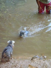 Depois de mais um pouquinho de caminhada, chegamos ao ponto final e, ansiosa que sou, acabei entrando num trecho do rio onde não devia. Não que tivesse algum perigo como fortes corredeiras ou coisas desse tipo. Acontece que era um local de fácil entrada, mas saída complicada. As paredes de terra que formavam as margens eram altas e, umedecidas pelas águas do rio, cederam quando a minha dona correu para me ajudar...resultado: as duas dentro d’água!!! E ela, de pochete e tudo, com celular, carteira, máquina fotográfica, etc. ahahahahaha, seria trágico se não tivesse sido hilário!!! Fomos rapidamente rebocadas para fora do rio pelos demais participantes e pelo tio da Radicais Natureza. Eu, saí serelepe, feliz da vida por ter dado mais um mergulho.....já a minha dona, acho que queria me esganar...ehehehehe….vou ficar sem ração hoje!!!